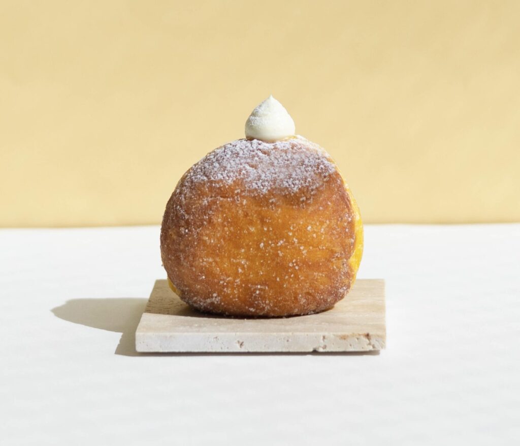 カスタードと生クリームを合わせた、軽やかな口溶けのカスタードホイップを入れた生ドーナツです。